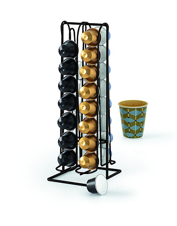 Elegantan metalni držač za 32 kapsule kave, crne boje. Kompaktno i pregledno rješenje za pohranu kapsula, savršeno za svaku kuhinju ili ured.