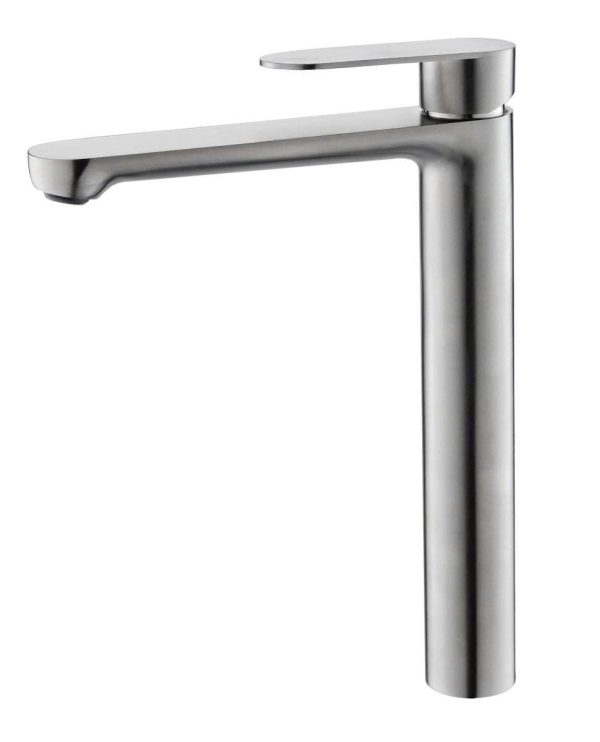Visoka slavina modernog dizajna izrađena od nehrđajućeg čelika SS304 u mat srebrnoj boji. Pogodna je za nadgradne umivaonike te se lako uklapa u različite stilove kupaonskog uređenja.