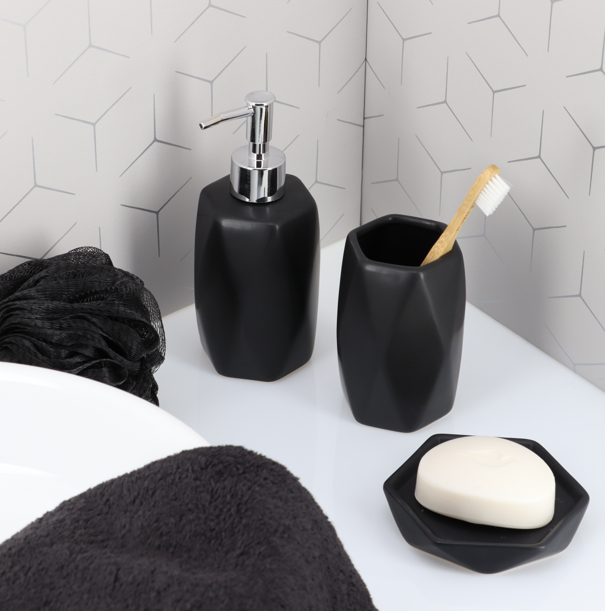 Držač četkica za zube Diamond shape od crnog kamena s četvrtastim, modernim i dizajnerskim linijama. Idealan za upotpunjavanje dekora kupaonice, postavljanjem blizu umivaonika kako bi pasta i četkice za zube cijele obitelji bile pri ruci. Dimenzija: 7,5×7,5×11,5cm.