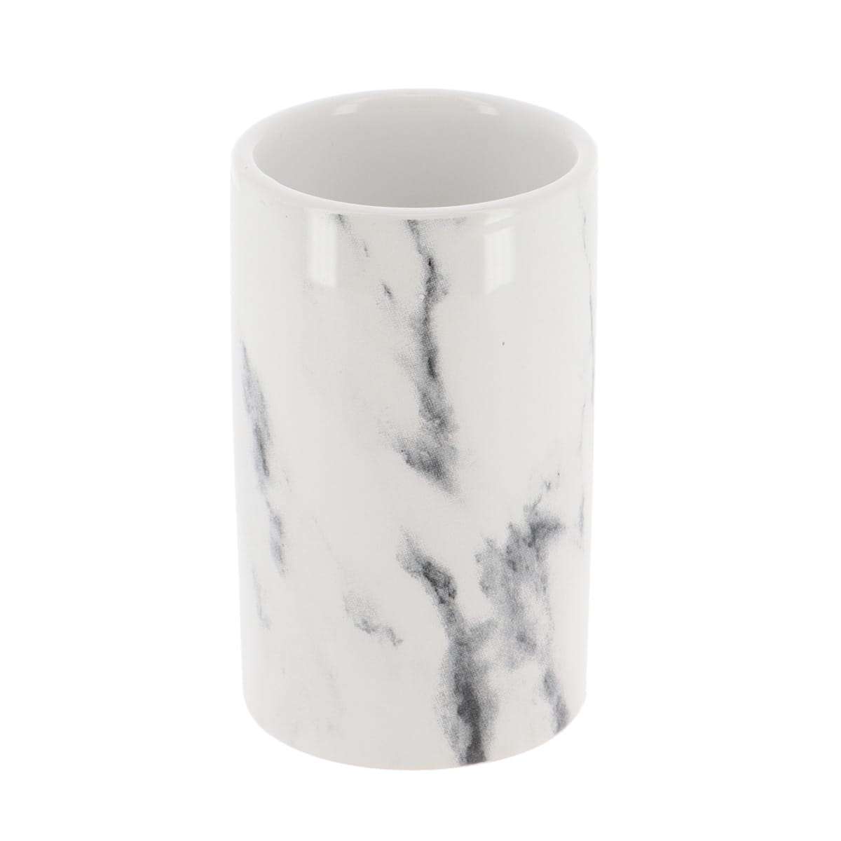 Uljepšajte svoje kupaonske umivaonike elegancijom i modernim stilom pomoću ove čaše Marbre koja je pogodna za odlaganje četkica za zube, paste, češljeva itd. Bijele boje prošarana sivim detaljima. Izrađena od dolomita. Dimenzija: 6,3x10cm.