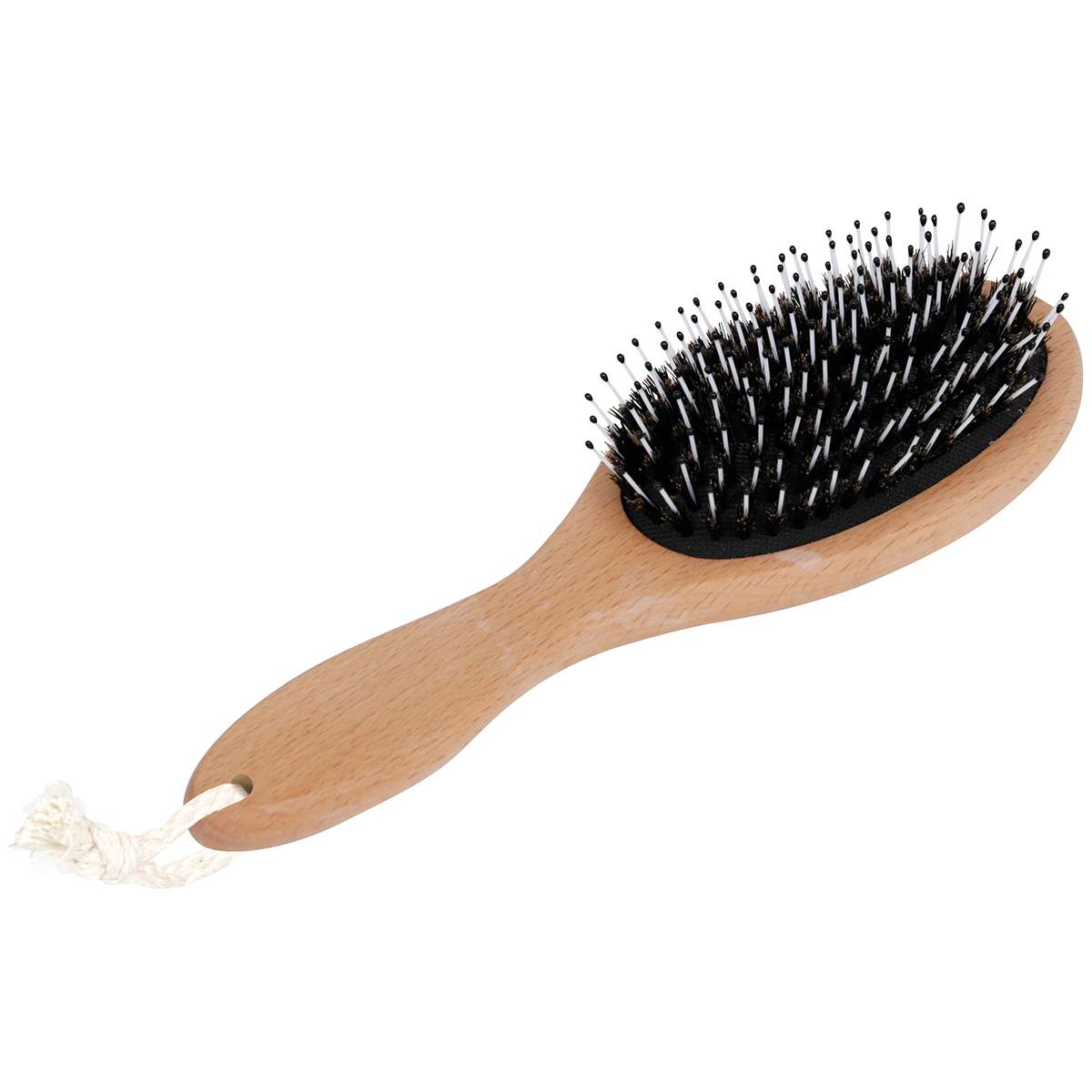 Ravna drvena četka za kosu s prirodnim vlaknima. Nježno raščešljava i masira vlasište, smanjuje statički elektricitet i potiče prirodni sjaj kose. Idealna za dnevnu njegu svih tipova kose.