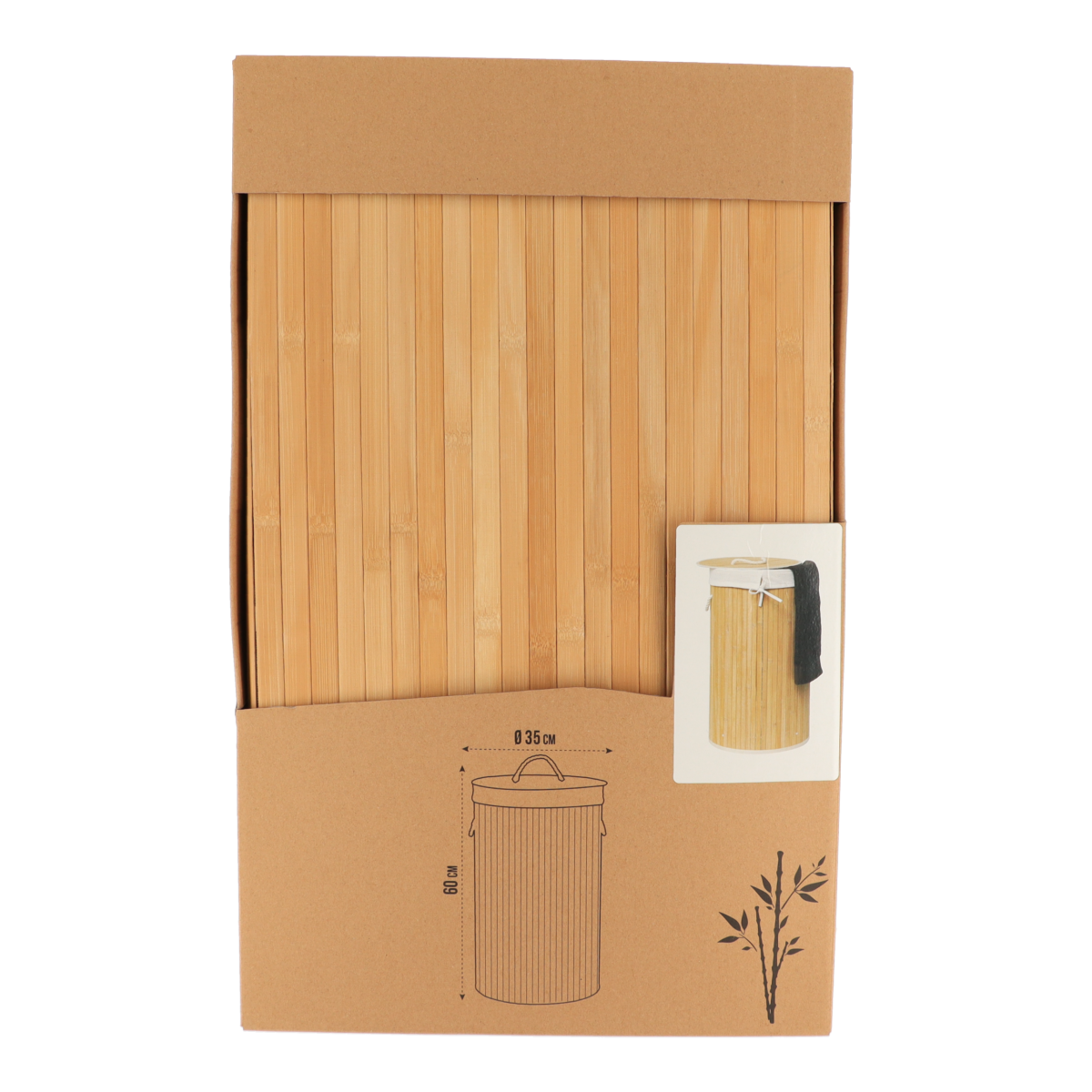 Svojim inovativnim okruglim dizajnom, ova košara za rublje od bambusa oduševit će svakoga. Iznutra je obložena tekstilnim umetkom. Dimenzija: 34x34x54 cm.
