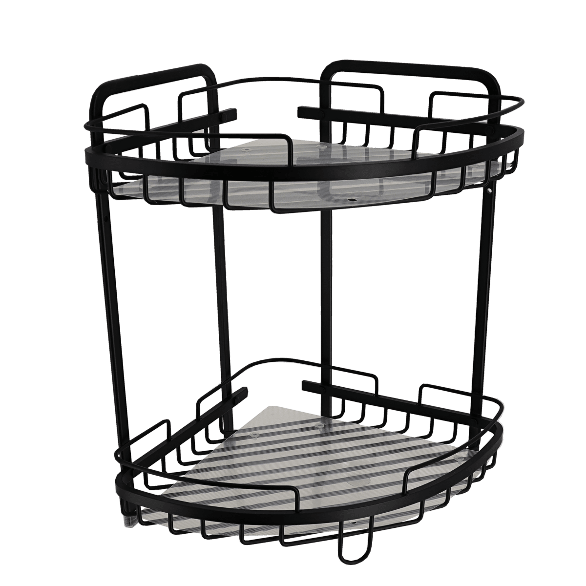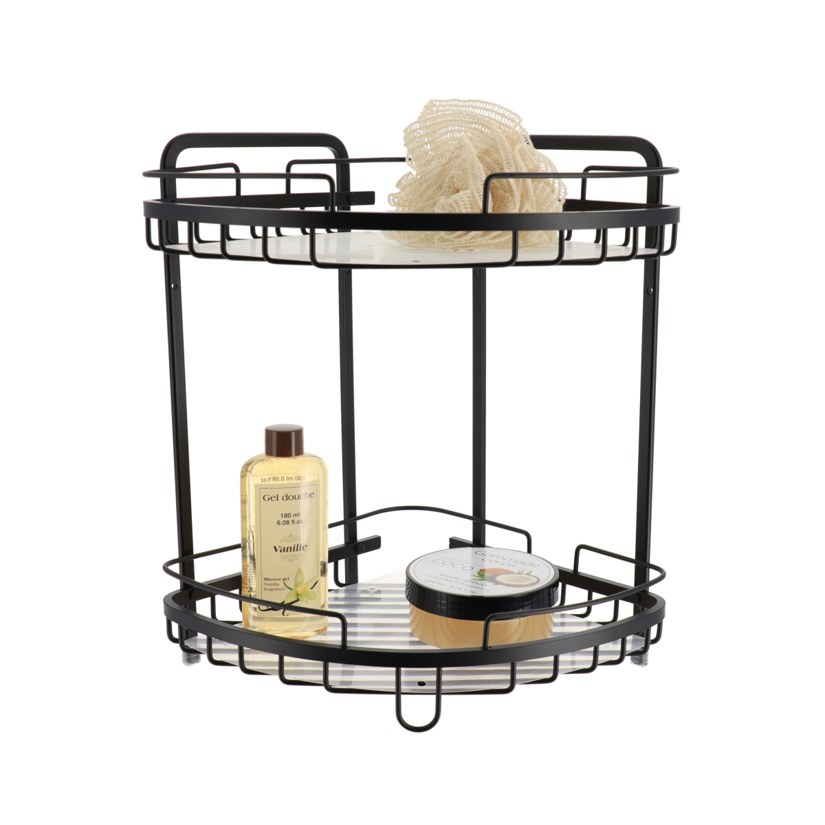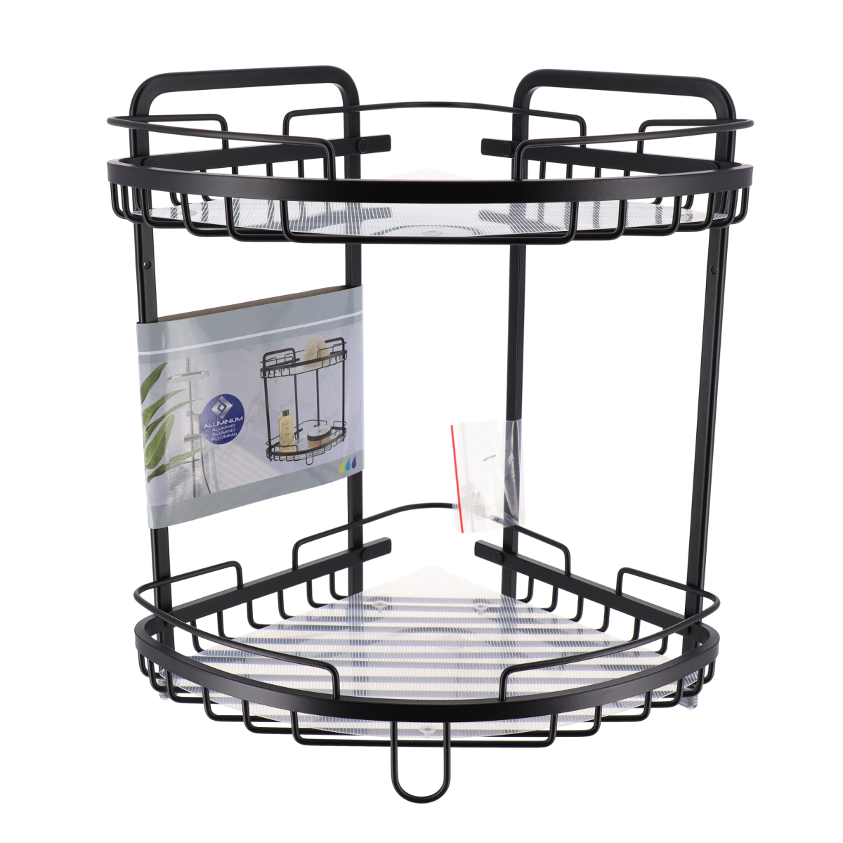 Crna aluminijska košarica za tuš s dvije police pruža dovoljno prostora za organizaciju proizvoda za tuširanje. Moderan dizajn čini je estetski privlačnim dodatkom kupaonici.