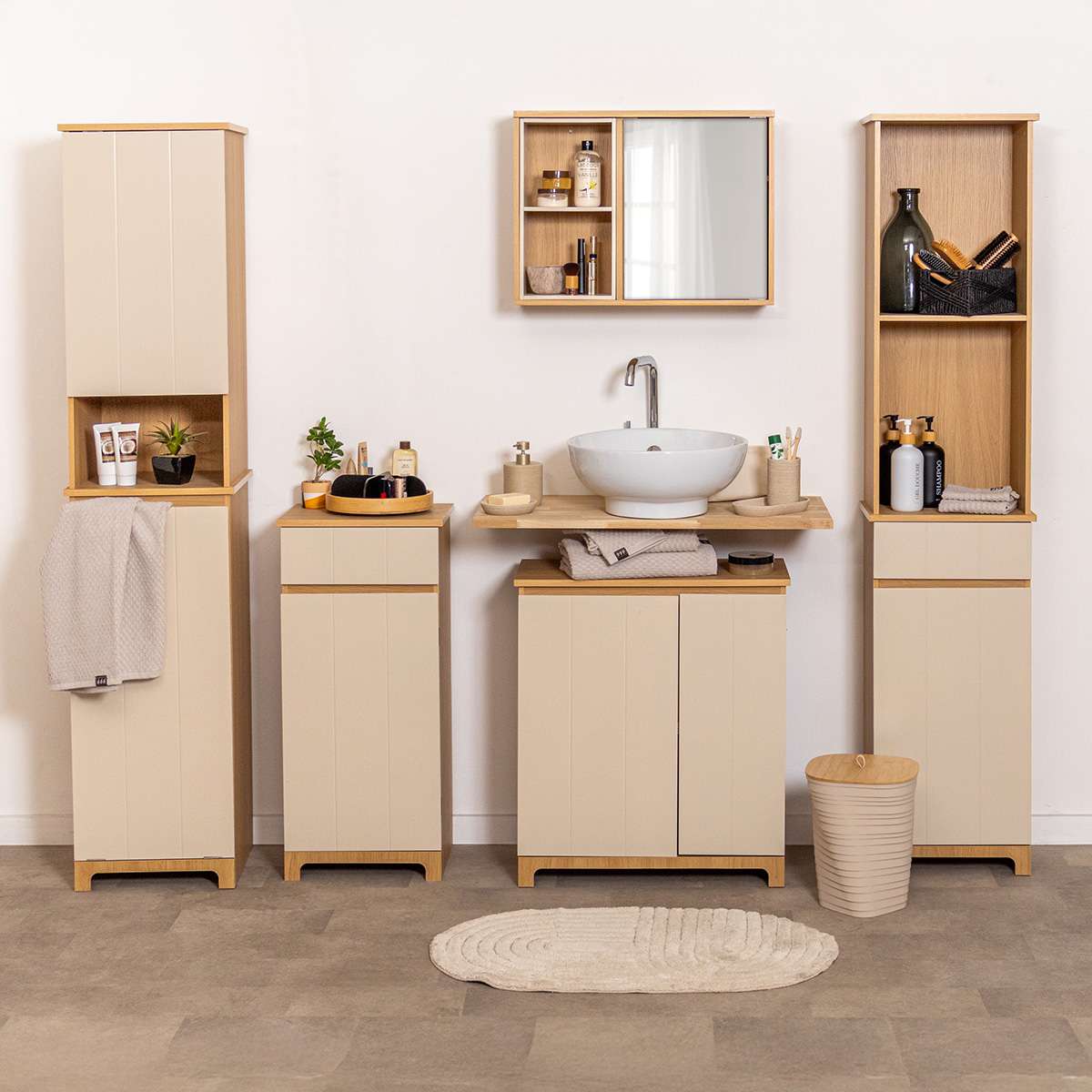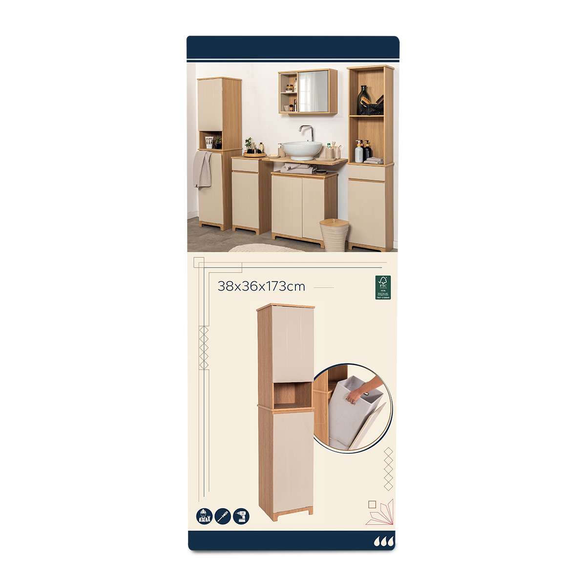 Ormarić Rivoli s dva vrata, jednom policom i ugrađenom košarom za rublje. Dimenzije: 173x36x38 cm. Praktično i vizualno privlačno rješenje za organizaciju prostora.
