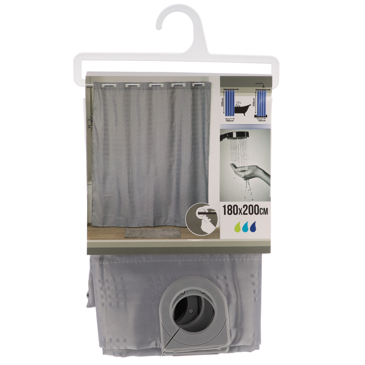 Zavjesa za kadu s integriranim alkama omogućuje brzo i jednostavno postavljanje bez dodatnih dodataka. Izrađena je od poliestera u sivoj boji, a dimenzije 180 × 200 cm pružaju učinkovitu zaštitu od prskanja vode.